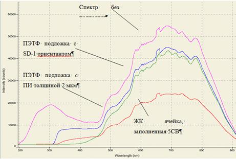 Из графиков 44-46 видно, что жидкий кристалл сильно поглощает в диапазоне длин волн 300-450 нм, а также в два раза снижает интенсивность на всем промежутке длин волн 200-900 нм. Сравнивая спектры ПЭТФ с ПИ толщиной 2 мкм и ЖК ячейки с ЖК марки 5CB, видно, что присутствие ПИ спейсеров не оказывает влияние на поглощение в диапазоне 300-450 нм.