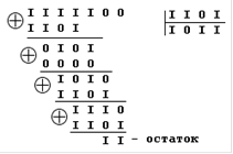 Допустим, что при передаче оказался искаженным символ в шестом разряде комбинации, то есть принята комбинация 1111100. В процессе декодирования производится деление многочлена, соответствующего принятой комбинации, на образующий многочлен. Выполним это деление, пользуясь только коэффициентами многочленов: