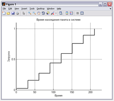 ts2c2 = [1,31,61,91,121,151,181,211];%крайние значения границ отрезков из отче-таc2 = [2.35,15.56,27.32,43.79,59.48,75.69,89.15,100.00]/100;%вероятности(ts2c2,fs2c2),%построение ступенчатого графика, set (gcf,'color','w')%параметры для разлиновки и заливки заднего фона= findobj('type','line'); %указание на объект типа линия для дальнейшего упрощения работы(h,'linewidth', 2, 'color', 'k')%задание параметров линии('Время'), ylabel('Загрузка'), %подпись осей('Время нахождения пакета в системе')%заголовок(gca,'box','off','ytick',0:0.5:5), %указание промежутков разлиновки и параметров([-1, 230,0,1.1])%указание крайних значений осей